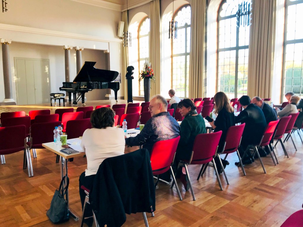 The competition takes place in the magnificent surroundings of the eighteenth century Orangery, a small palace built in 1721 by Remy de la Fosse in a baroque garden as winter quarters for orange trees. At present it is late autumn in Darmstadt but we are immersed in an Indian summer of sun, warmth and in addition are working in a glorious venue. The fine XII International Chopin Piano Competition is organized by the Chopin-Gesellschaft in der Bundesrepublik Deutschland E.V. who are celebrating their 50th anniversary.