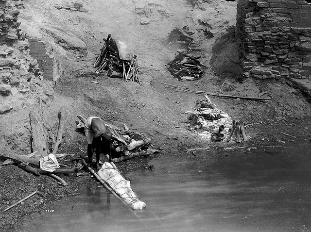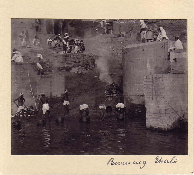 Early one morning Eddie and George took a boat and glided down the Ganges at sunrise. The entire river bank was thronged with bathers and the river itself dotted with boatmen disposing of remains or ashes. An occasional corpse or dead dog floated past. The water was clearly polluted yet the pilgrims drank of it to purify themselves, believing it miraculous. The panorama reminded Eddie of Arcadian classical paintings by Poussin or Claude, Carthage in ruins. In the evening the shore was lit fitfully with oases of light. These were the Burning Ghats* of Kashi, the most exalted of them being the Ghat of Manikarnika.