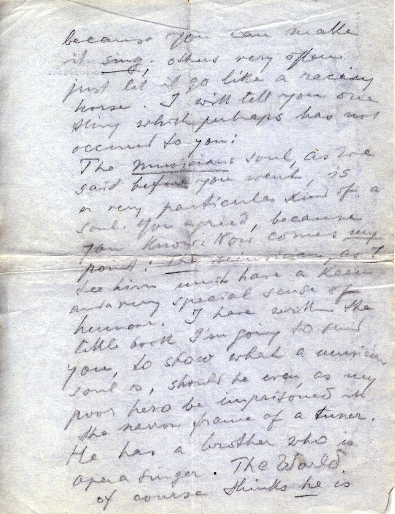 The musician’s soul, as we said before you went, is a very particular kind of soul. You agreed, because you know. Now comes my point: The musician, as I see him must have a sense a keen and very special sense of humour. I have written the little book I’m going to send you, to show what a musician’s soul is, should he ever, as my poor hero, be imprisoned within the narrow frame of a tuner. He has a brother who is an opera singer. The World of course thinks he is the musician.