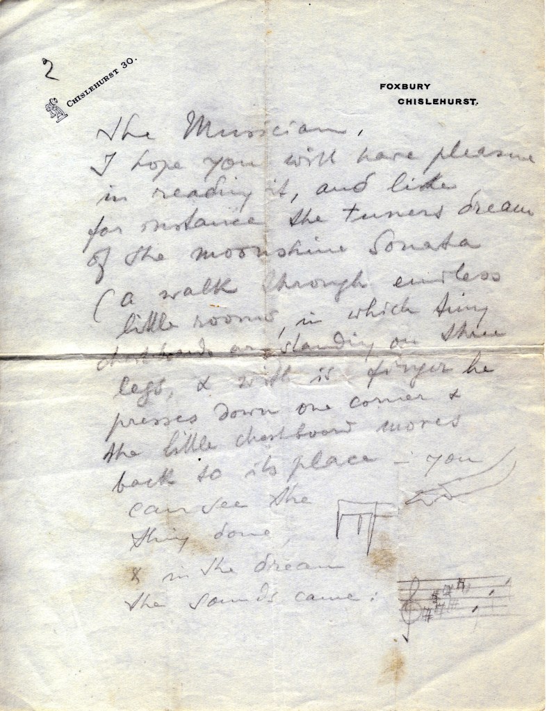 I hope you will have pleasure in reading it, and like the in- stance of the tuner’s dream of the Moonshine [sic] Sonata (a walk through endless little rooms, in which tiny chessboards are standing on three legs & with his finger he presses down one corner & the little chessboard moves back to its place – you can see the thing done [small drawing of three-legged ‘chessboard’ with hand and finger emerging from a sleeve about to press down on it] & in the dream the sounds came [Underlining in the original. Treble Clef drawn on a stave with correct key signature and three opening notes of the Moonlight Sonata].