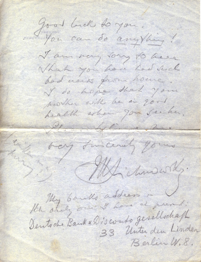[She then mysteriously includes the address of her bank in Berlin as her only correspondence address and the words ‘written in a hurry!’]